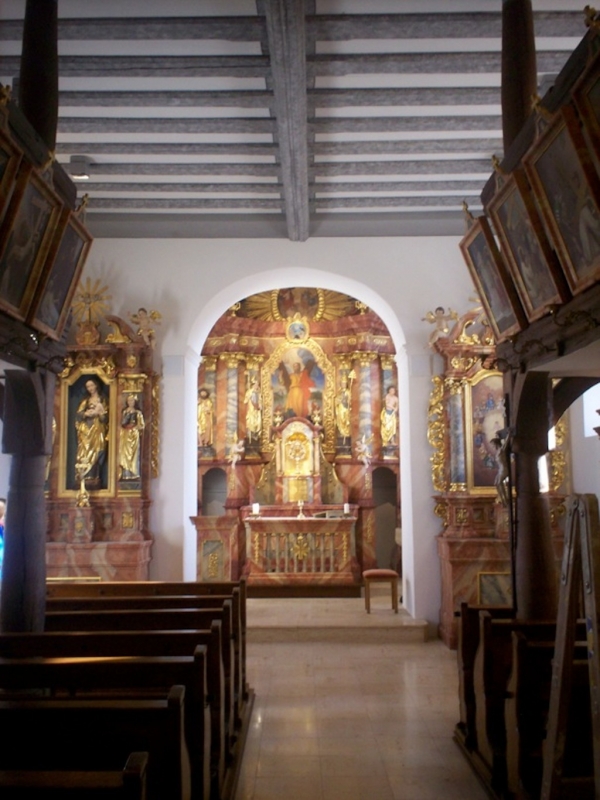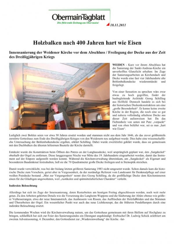 Sanierung katholische Filialkirche St.Andreas in Weiden, Freilegung historischer Bohlen-Balken-Decke, Versetzung des Langheim-Wappens, Säuberung der Altäre, Innenanstrich und Auffrischen des bestehenden Holzfußbodens, modernes Lichtkonzept mittels indirekter Beleuchtung