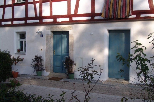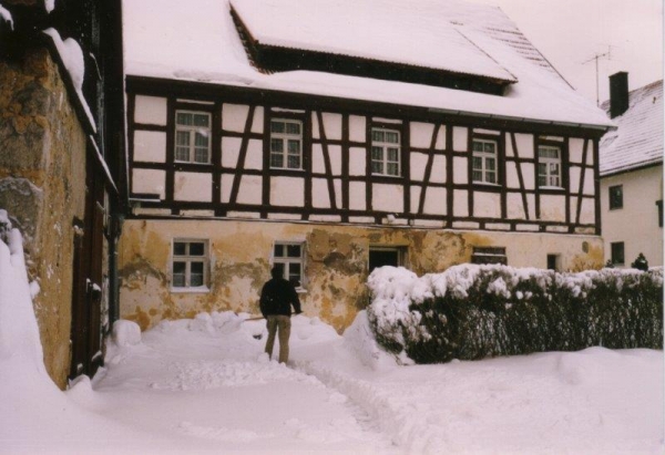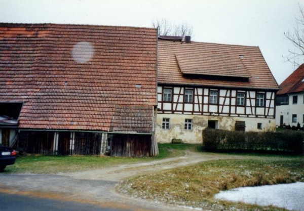 Ehemaliges Wohnstallhaus, jetzt Wohnhaus mit Scheune. Wohnhaus EG Bruchsteinmauerwerk, verputzt, OG Fachwerk