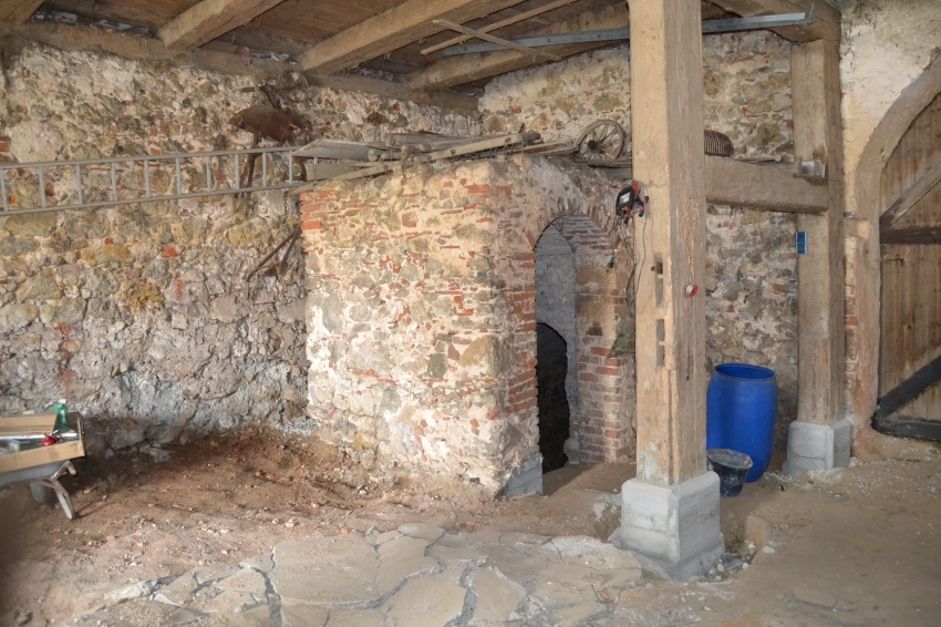 Der Giebel zur Hauptstrasse, B2 Der Stadel hatte eine Tenne und 2 Bahrnteile. Jetzt ein großer Raum, die Deckenbalken durch zwei Unterzüge mit je 4 mächtigen Säulen gestützt.
