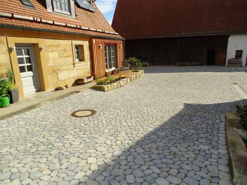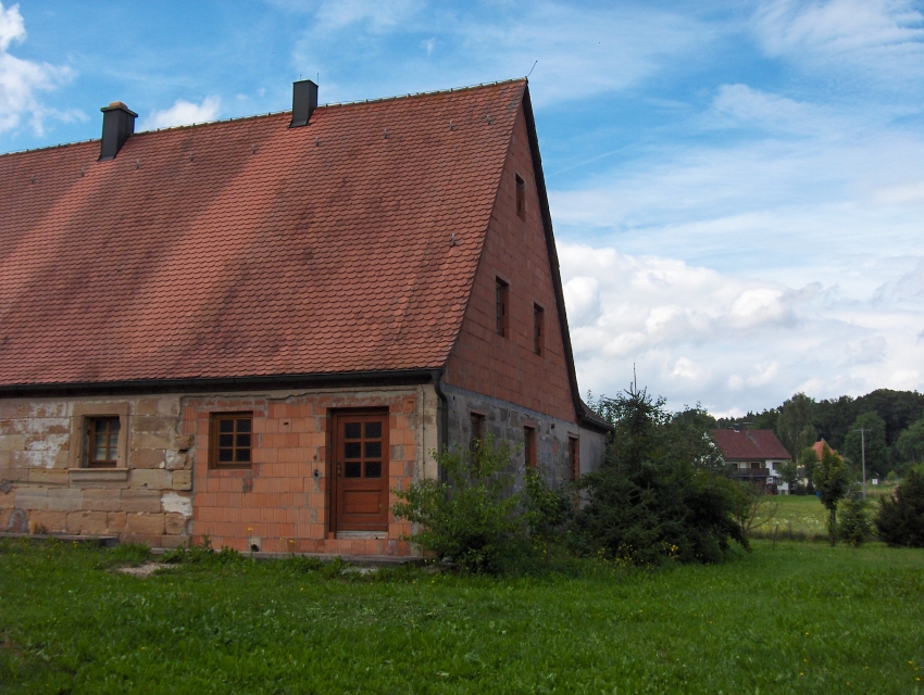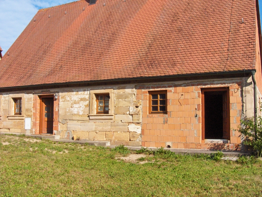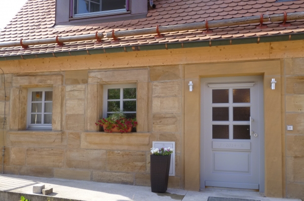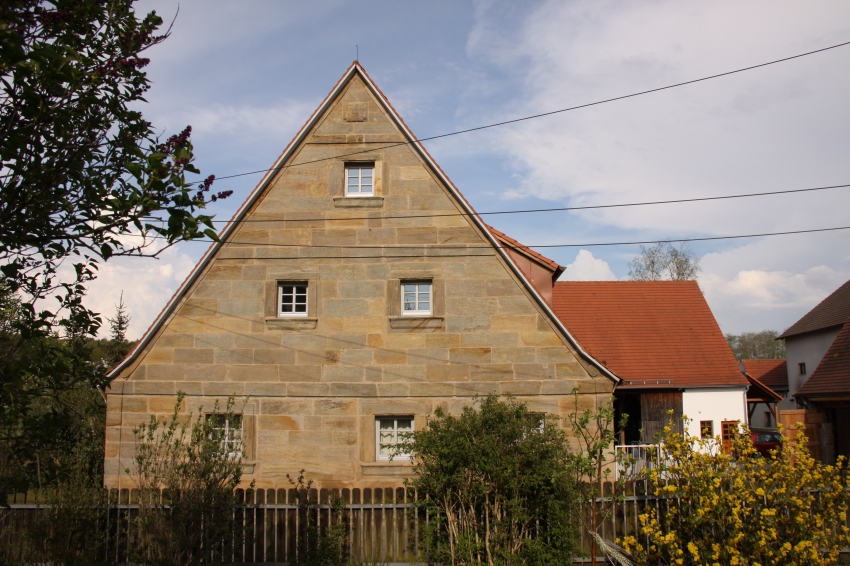 Der Martinshof in Rosenbach/Neunkirchen am Brand ist ein Dreiseithof mit Wohnstallhaus und Backhaus, beide aus Sandstein sowie einer Scheune. 1778 Kauf des Martinshofes durch Johann Christian Knapp, 1792 (Neu-)Errichtung des Wohnstallhauses, im Besitz der Familie Knapp bis in die 1990er. Durch einen Brand 1985 bis auf die Sandsteinmauern zerstört, folgend wieder errichtet, jedoch durch Tod des Eigentümers im Rohbauzustand verblieben. Bis zum Brand landwirtschaftlich genutzt. 2012 Erwerb durch uns, Restaurierung und Innenausbau, Fertigstellung 2014 (Haus), 2017 (Hofanlage). Die erhaltenen Sandsteinmauern sind die wichtigsten Zeitzeugen, weshalb unser besonderer Fokus auf Erhalt und Restaurierung dieser lag. Besonderheiten der Fassade stellen u.a. die profilierten Fenstersimse, die Schneckenornamente und die Lisenen an den Gebäudeecken dar. Fachliche Unterstützung erhielten wir von Prof. Koch, Geozentrum Nordbayern/Uni ER, der die Substanz des Mauerwerks im Rahmen einer Masterarbeit untersuchen ließ. Mit der Durchführung der Fassadenrestaurierung waren die beiden renomierten bamberger Unternehmen Klesse und Bauer-Bornemann betraut. Geleitet wurden die Arbeiten von Herrn Straßgürtl, kjs+ Architekten, Erlangen. Im hinteren ehem. Stallbereich waren durch die frühere Nutzung und den Brand bereits größere Teile der Sandstein-/Fachwerkfassade zerstört und von unseren Vorgängern durch Ziegelmauerwerk ersetzt worden. Die Herausforderung bestand somit darin, den vorderen, denkmalgeschützen Teil des Hauses mit dem hinteren wieder in Einklang zu bringen und den ländlichen Charakter zu unterstreichen, wirtschaftliche und bauphysikalische Aspekte zu beachten und den Hof als Gesamtensemble (wieder) erstehen zu lassen. So wurde z.B. eine hinterlüftete Fassade aus unbehandeltem Lärchenholz für den hinteren Gebäudeteil gewählt, um diesem gerecht zu werden. Somit ergänzt sich ein alter vorderer Hausteil und ein neuer hinterer ohne dass die unvermeidliche Verwendung von einigen Dachfenstern oder Rollos als störend empfunden würde. Im Inneren erfolgte die Ausstattung auf modernem Niveau unter Berücksichtigung des alten Charakters, moderne Technik, Elemente mit klassischem Erscheinungsbild (z.B. Türen mit Kassettenoptik) und Naturmaterialien (v.a. Sandstein, Lehm, Eiche) wurden zu einem stimmigen Konzept vereinigt. Das Heizkonzept setzt zweischienig auf: Zum einen Nutzung erneuerbarer Energien (Erdwärme, Solarthermie) für Niedertmeperaturfussboden- und –wandheizung, zum Anderen ein Holzofen mit Wärmespeicher und Warmluftverteilungssystem über alle Stockwerke. Es war eine große Herausforderung, die ganz alten, ursprünglichen Elemente, die von den Vorbesitzern unvollendeten Arbeiten und unsere eigenen Anforderungen auf einen Nenner zu bringen. Unter den Gesichtspunkten „Altes bewahren, mit Neuem verbinden, auf die Details achten“ wurde auch der Hof gestaltet und angelegt und zu einer Einheit gebracht. Heute gehört der Martinshof sicherlich wieder zu den schönsten Höfen in Rosenbach und selbst ein gewisser landwirtschaftlicher Charakter wurde ihm zurückgegeben durch die Haltung von Pferden und die damit verbundene Nutzung und Pflege der zugehörigen Weideflächen sowie des Waldes.